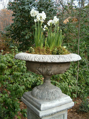 Bombe chest with a baby Christmas tree in an urn....so very garden-y.